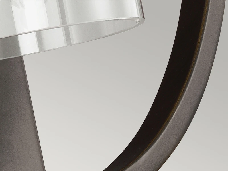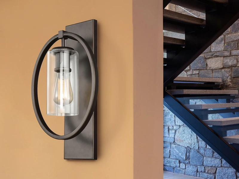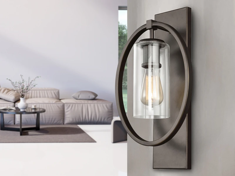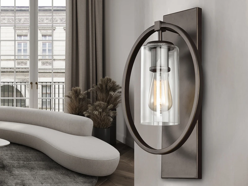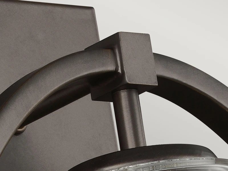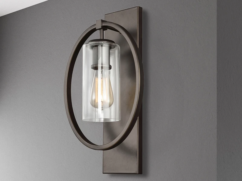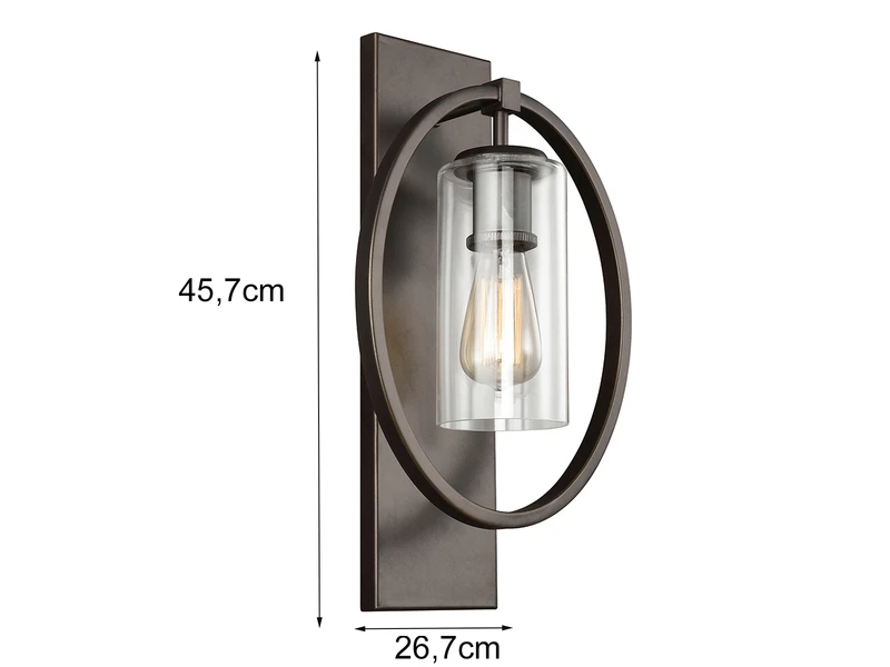 Der Korpus der Wandleuchte besteht aus bronzefarbigem solidem Stahl. Der äußere Ring umrahmt elegant den Lampenschirm aus Glas. Der Material Mix aus massivem Stahl mit dem Lampenschirm aus Klarglas verleiht der Wandleuchte einen Hauch von Industrial Style.