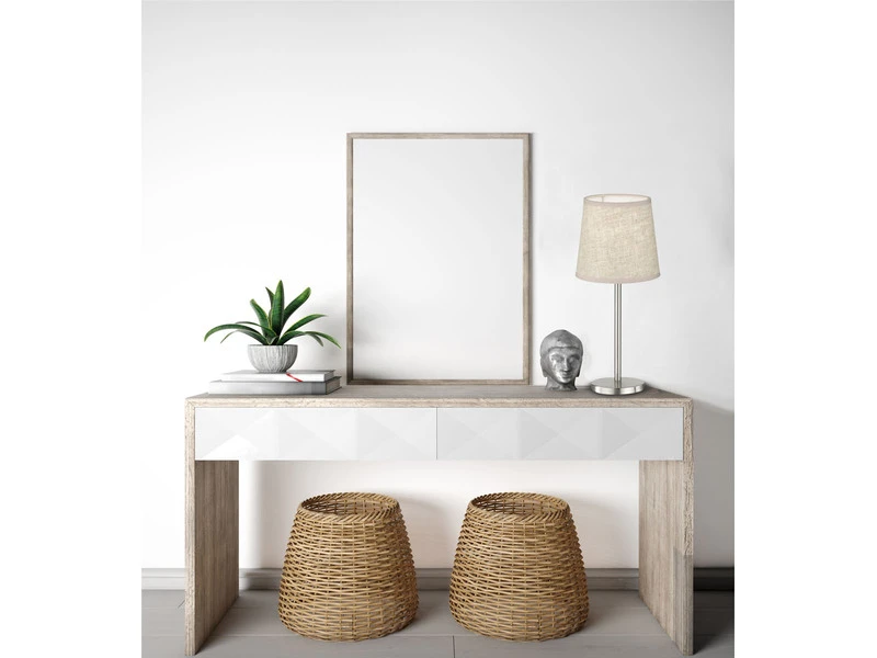 Der runde Schirm hat einen Durchmesser von 14cm und ist aus sandfarbenem Leinenstoff gefertigt. Der Leuchtenfuß aus Silber mattem Metall verleiht der insgesamt 30cm hohen Tischlampe einen eleganten Charakter.