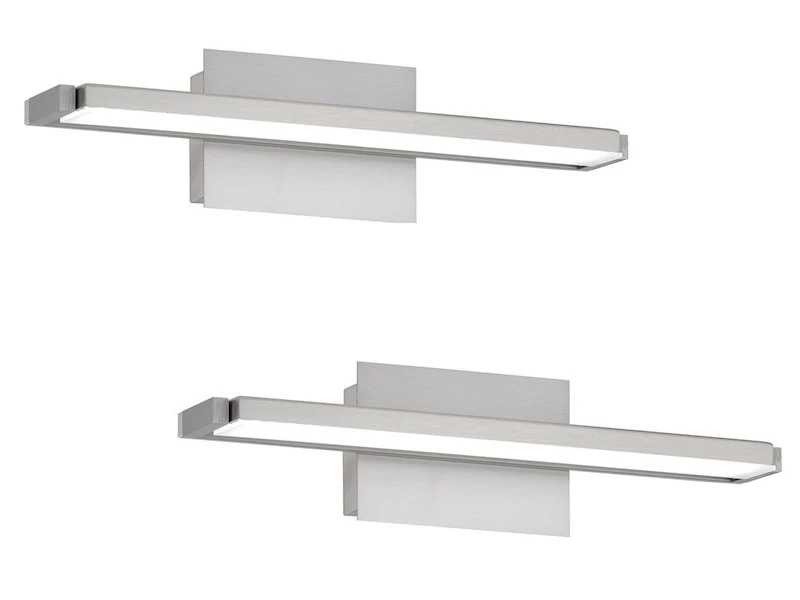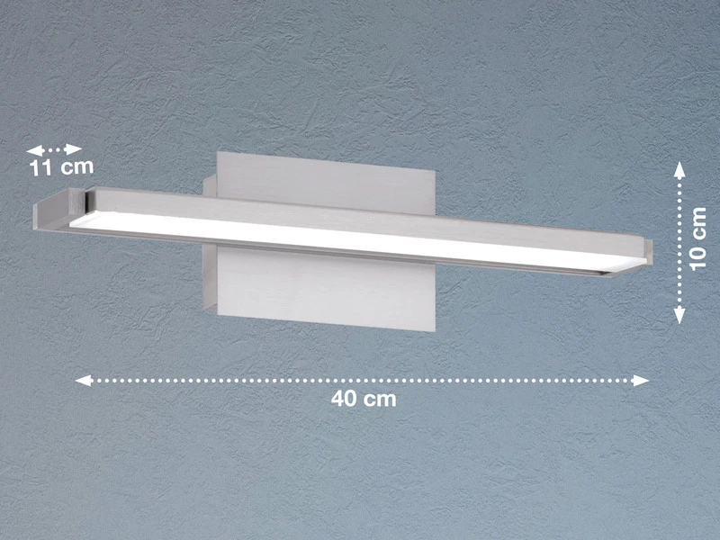 Der schmale, klar definierte Leuchtenkorpus aus Metall hat eine Länge von 40cm. Insgesamt hat jede der beiden Wandleuchte eine Höhe von 10cm und eine Wandausladung von 11cm. Der Leuchtenkopf ist mit einer Weiß matten Acrylglasabdeckung versehen und schwenkbar, so dass Sie die Wandlichter sowohl als Uplight, Downlight oder für eine indirekte Wandbeleuchtung nutzen können.