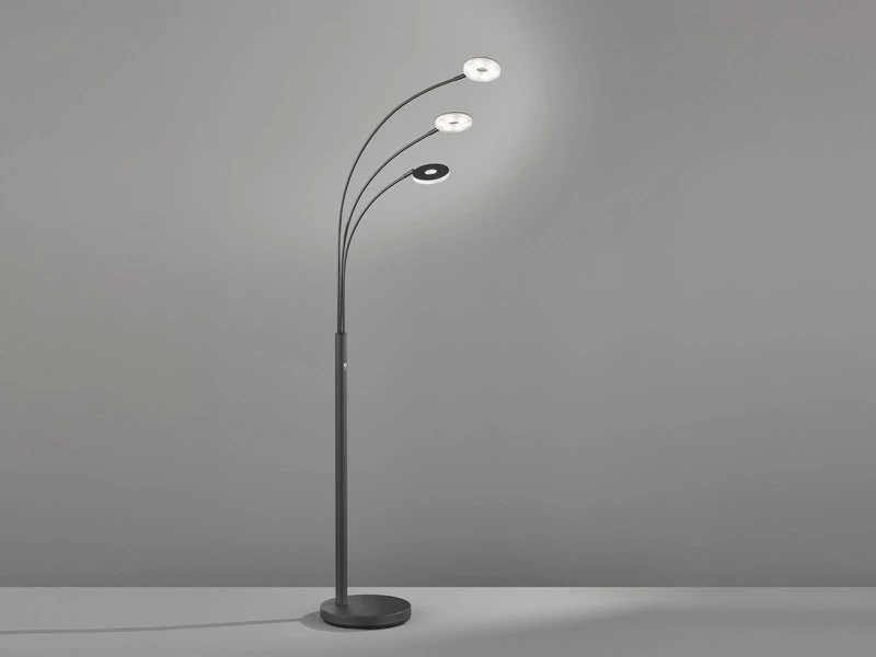 Über den Tasterschalter am Leuchtenkorpus lässt sich die Bogenlampe aus dem Hause Fischer & Honsel nicht nur an/ausschalten, sondern ist auch stufenlos dimmbar und lässt sich in 3 Stufen von Warmweiß bis Neutralweiß in der Lichtfarbe verändern.