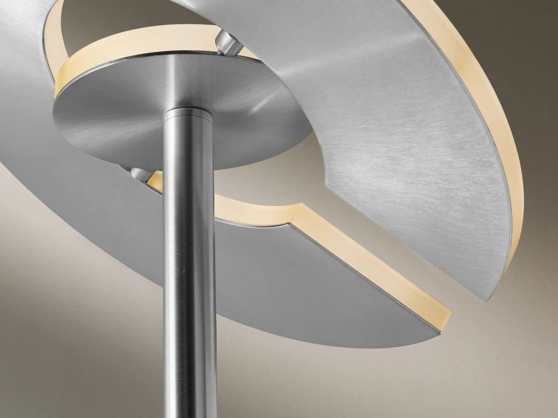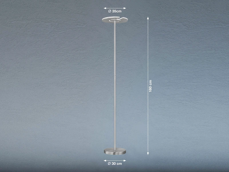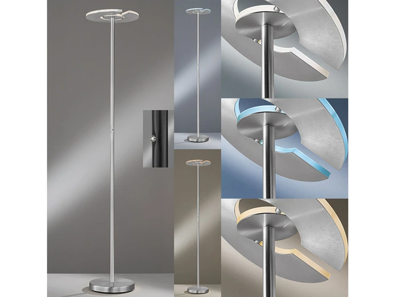 Der Deckenfluter DENT erfüllt Ihnen jeden Lichtwunsch. Der Korpus der 180 cm hohen Stehlampe besteht aus silberfarbenem, mattem Metall und ergänzt sich harmonisch mit dem ringförmigen Leuchtenkopf mit weißem Acrylglas.