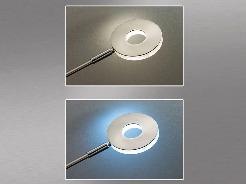 Die Leselampe ist mit einem Flexschlauch versehen und kann somit individuell ausgerichtet werden. Auch der äußere Ring des Flutlichts befindet sich an einem flexiblen Gelenk. Dadurch kann das Deckenlicht in verschiedene Richtungen strahlen.