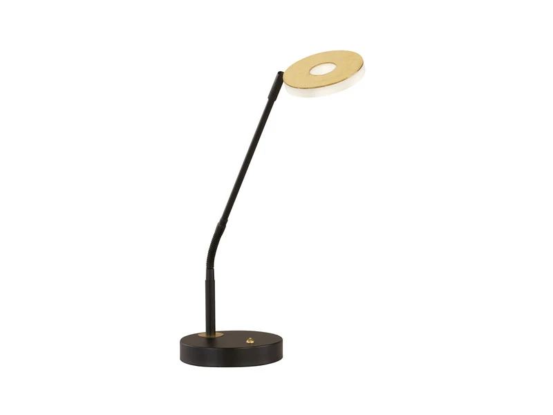 Der Korpus der 60cm hohen Schreibtischleuchte DENT besteht aus matt schwarzem Metall und ergänzt sich besonders stilvoll mit den blattgoldfarbenen Details am Leuchtenfuß und an der ringförmigen Brennstelle mit weißem Acrylglas.