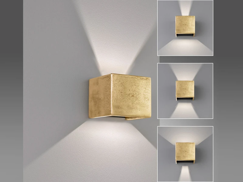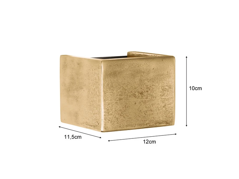 Die kleine, würfelförmige Wandleuchte hat eine Wandausladung von 11,5cm. Der Metallkorpus in Goldfarben Antik hat eine Breite von 12cm und eine Höhe von 10cm.