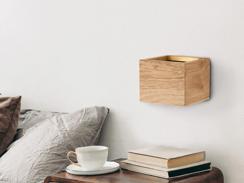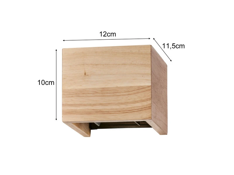 Die kleine, würfelförmige Wandleuchte hat eine Wandausladung von 11,5cm. Der Holzkorpus in Eiche Optik hat eine Breite von 12cm und eine Höhe von 10cm.