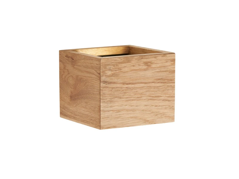 Die kleine, würfelförmige Wandleuchte hat eine Wandausladung von 11,5cm. Der hochwertige Leuchtenkorpus ist aus geölter Eiche, hat eine Breite von 12,5cm und eine Höhe von 10cm.
