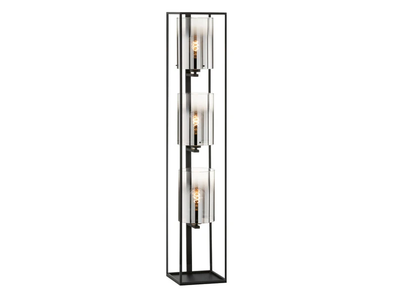 Die Designstehleuchte setzt sich aus einem geradlinigen, 24×24 cm großen Leuchtenkorpus aus schwarzem Metall sowie drei zylinderförmigen Rauchglasschirmen mit einem Durchmesser von jeweils 18 cm (Schirmhöhe jeweils 25 cm) zusammen. Der Retro Look wird durch den angesagten Farb- und Materialmix perfekt abgerundet und sorgt für ein tolles Erscheinungsbild. Durch die Metall- und Glasdetails ist die Leuchte in jedem Fall sehr dekorativ und lässt sich in viele Einrichtungsstile perfekt integrieren.