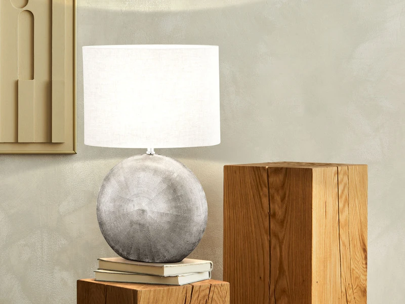 Der halbrunde Lampenfuß ist aus Keramik in Silberfarben Antik mit Struktur gefertigt. Der ovale, 34x17cm große Lampenschirm aus weißem Leinenstoff rundet das stilvolle Design der Tischleuchte harmonisch ab.