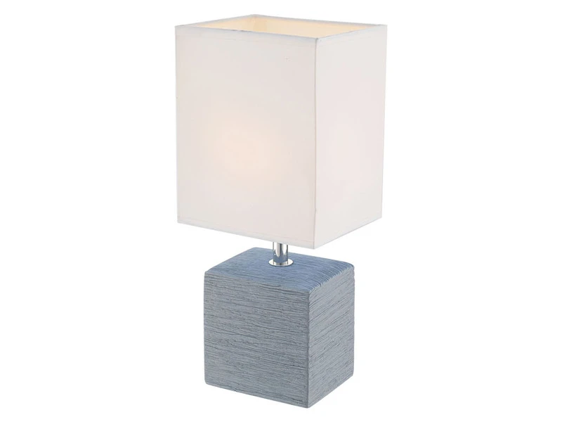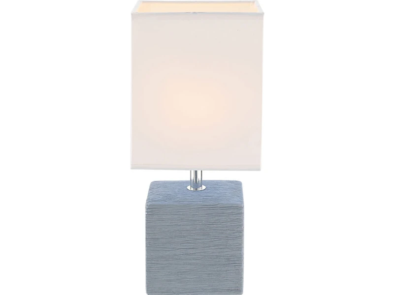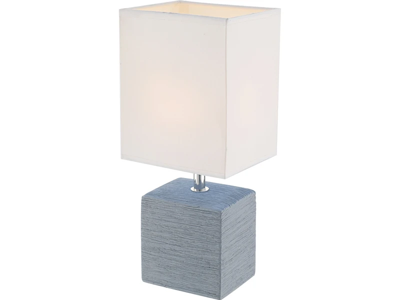 Das klassische Design der 29 cm hohen Tischlampe erhält durch die dezente Farbgebung in Grau und Weiß eine besondere Note. Der Sockel der Leuchte ist aus Keramik und wird durch die eingearbeitete, feine Struktur harmonisch aufgelockert. Der Schirm ist aus Stoff und hat eine Größe von 13 x 11 cm. Die Tischleuchte verfügt über ein 120cm langes Kabel. Über einen Schnurschalter für Ein/Aus lässt sich die Tischleuchte komfortabel bedienen.