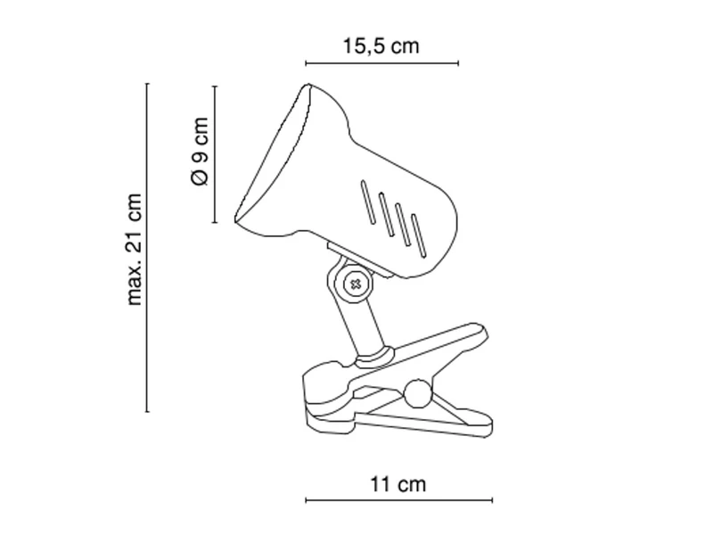 Der Korpus der Klemmleuchte besteht aus Kunststoff. Der silberfarbene Spot hat einen Durchmesser von 9 cm. Die Tischleuchte selbst hat eine maximale Höhe von 21 cm und eine Ausladung von 15,5 cm. Die schwarze Klemme ist 11 cm lang und sorgt für einen guten Halt.