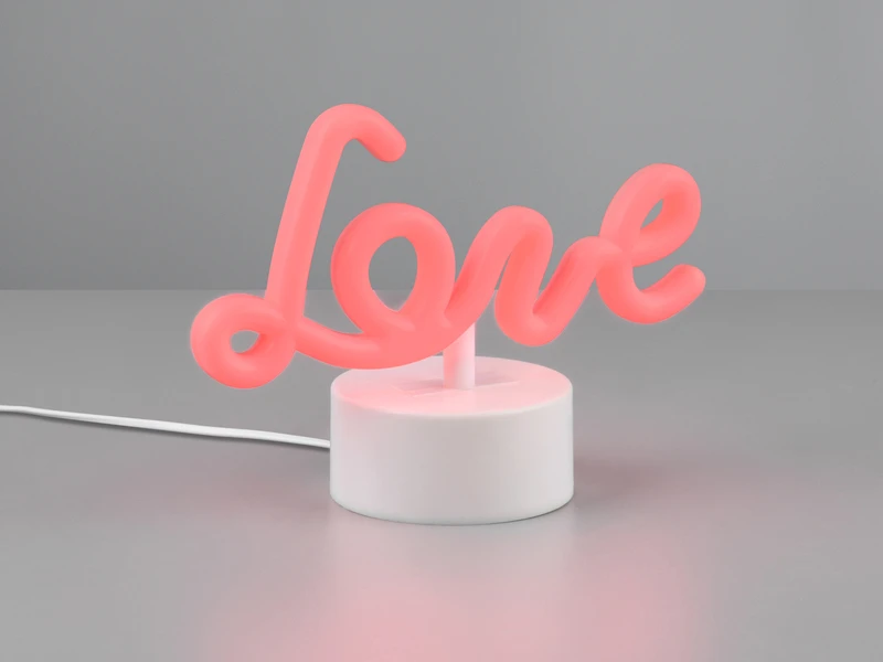 Das fest verbaute LED je Leuchte hat eine Leistung von 1 Watt lässt den Schriftzug in der Farbe Pink leuchten. Über den AN-AUS Schalter unter dem Leuchtensockel lassen sich die Dekoleuchten bequem schalten.