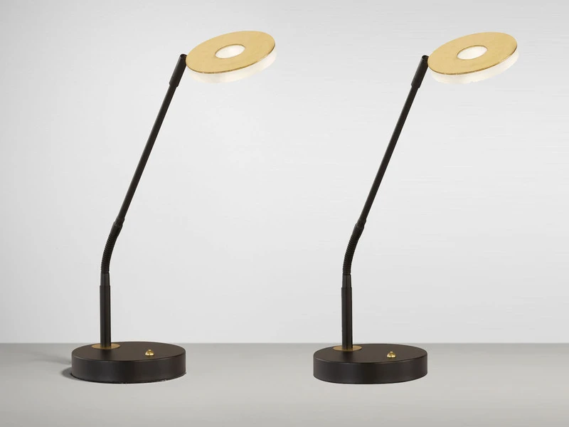 Der Korpus der jeweils 60cm hohen Schreibtischlampen besteht aus matt schwarzem Metall und ergänzt sich besonders stilvoll mit den blattgoldfarbenen Details am Leuchtenfuß und an der ringförmigen Brennstelle mit weißem Acrylglas.