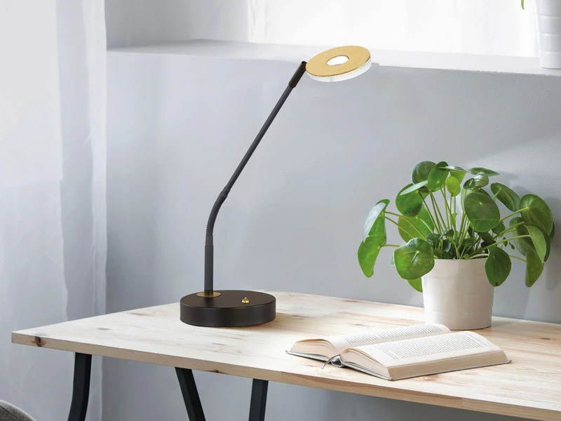 Über den Tasterschalter am Leuchtenkorpus lassen sich die Schreibtischlampen komfortabel bedienen: Nicht nur an/aus, sondern auch stufenlos dimmbar sowie Einstellen der Lichtfarbe in 3 Stufen von Warmweiß bis Neutralweiß ist möglich.