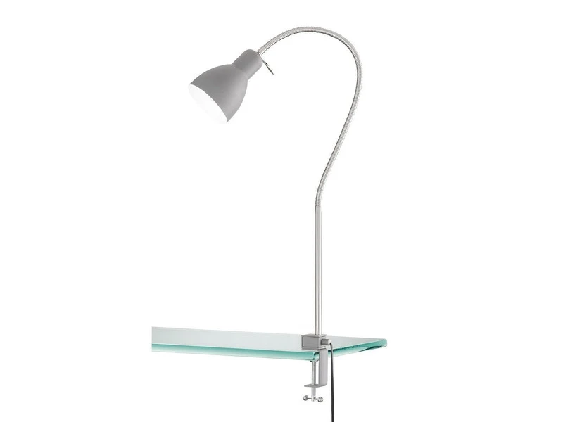 Die Oberfläche der Klemmlampe besteht aus Metall in Sandgrau, der Flexschlauch ist in Nickel matt gehalten. Die Leuchte hat eine Ausladung von 65 cm, ist – je nach Einstellung des Flexschlauchs – zwischen 50 cm bis 100 cm hoch und lässt sich an allen Möbelstücken oder Regalbrettern mit einer Klemmbreite von 1 cm bis max. 6,5 cm befestigen.