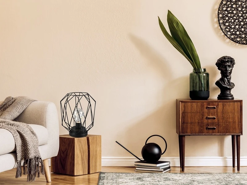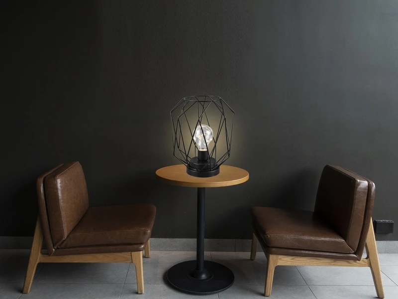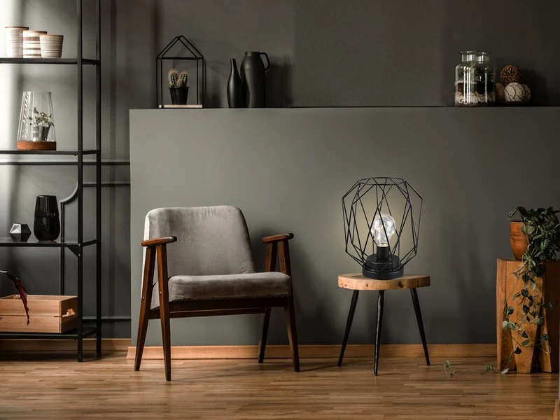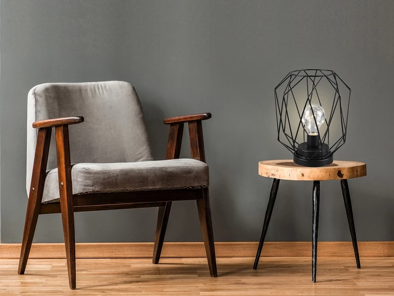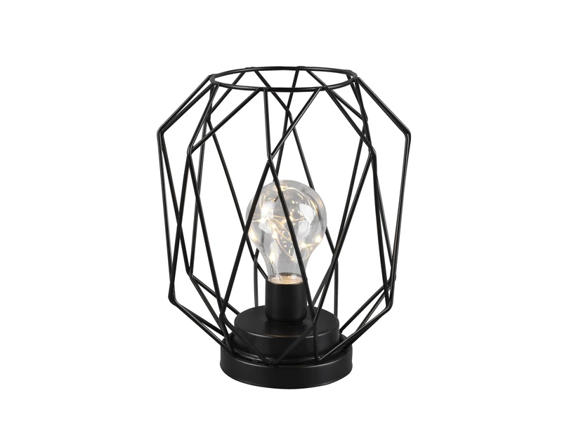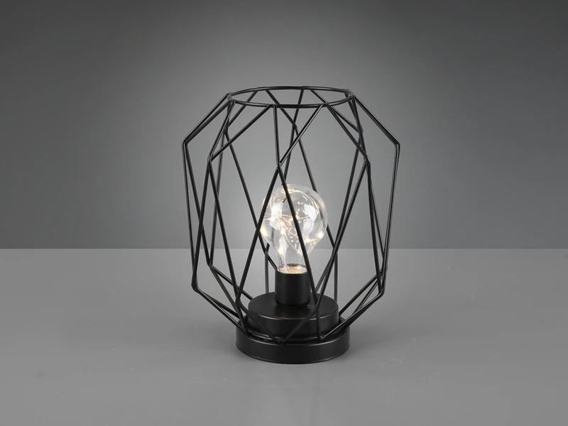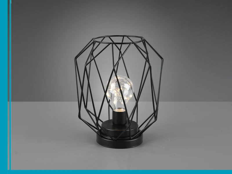 Der Lampenschirm aus Draht verleiht der Tischleuchte einen Vintage Industrial Style und macht die kabellose LED Tischleuchte aus schwarzem Metall zu einem echten Hingucker.