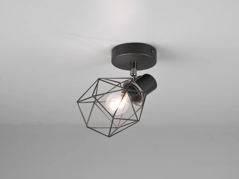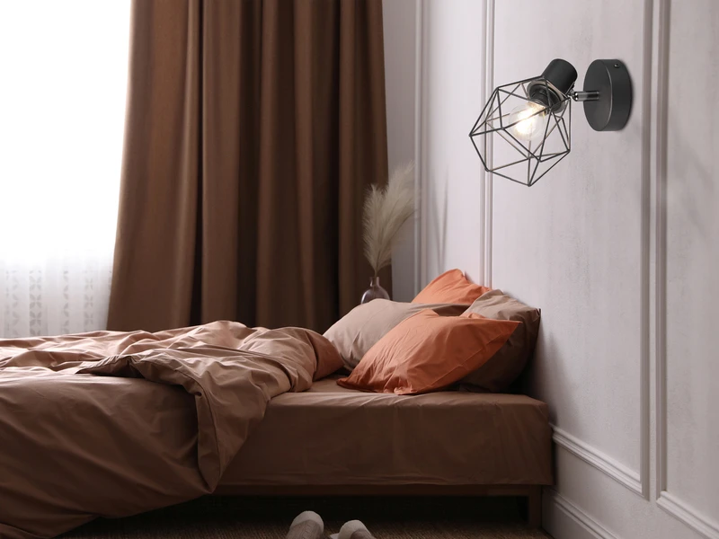 Das besondere Erscheinungsbild der Wandlampe entsteht durch den schwarzen Gitterlampenschirm der den Blick auf das Leuchtmittel freigibt.