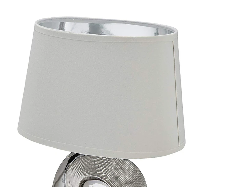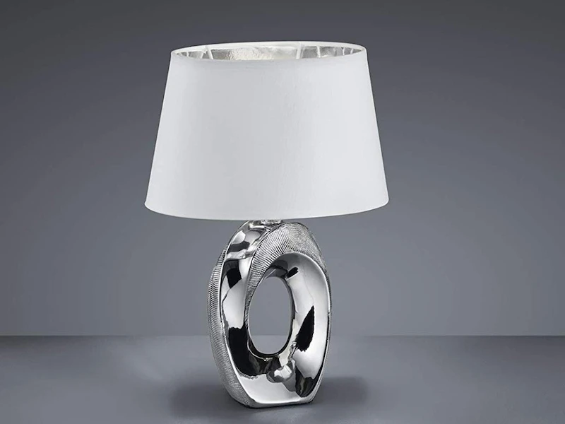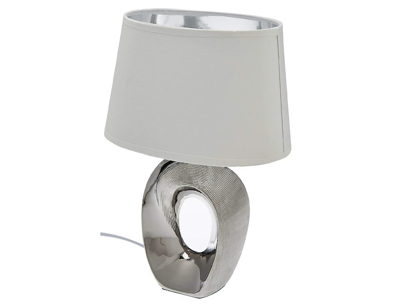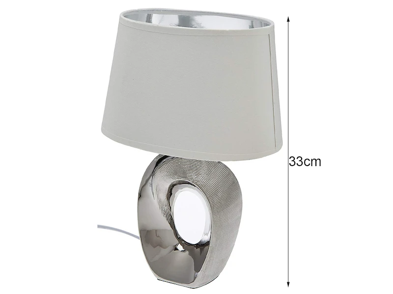 Die Tischleuchte zaubert für jeden Stil die passende Lichtstimmung und ist dabei unglaublich dekorativ. Ob als Nachttischleuchte im Schlafzimmer, auf der Kommode oder auf dem kleinen Beistelltisch im Wohnzimmer, die Leuchte mit einer Größe von 23×33 cm wird auch tagsüber zu einem echten Blickfang. Der silberfarbige Keramikfuß ergibt zusammen mit dem außen weiß und innen silberfarbigen Stoffschirm ein modernes und zugleich klassisches Gesamtbild ab, dass sich ideal in unterschiedliche Einrichtungsstile integrieren lässt.