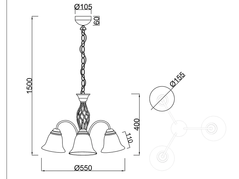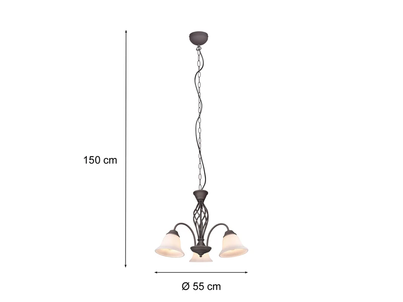 Das Pendel ist mit drei E14 Fassungen ausgestattet und wird inklusive passender LED Leuchtmittel mit einer Leistung von jeweils 5 Watt und 400 Lumen in Warmweiß geliefert. Diese sind dimmbar, so dass Sie bei zusätzlichem Einbau eines Wanddimmers für eine ganz individuelle Beleuchtung sorgen können.