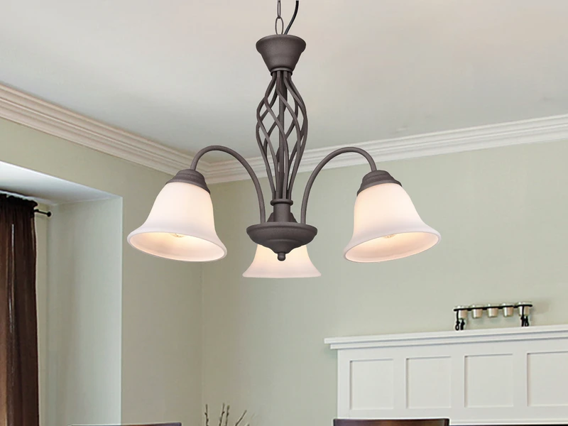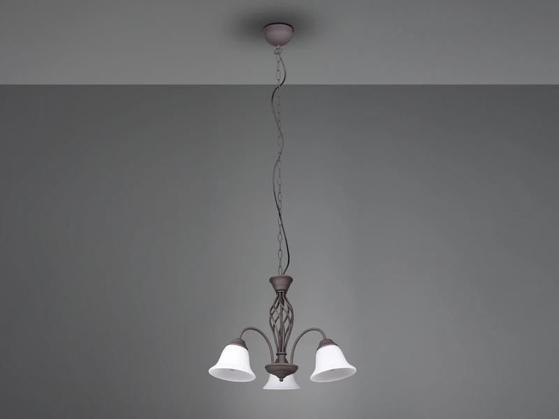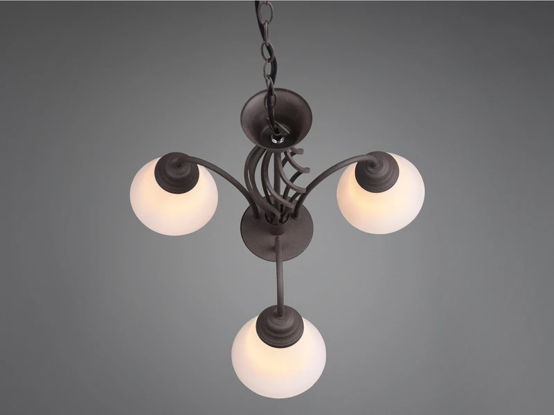 Rustikale Metallelemente treffen auf stilvoll geschwungene Glasschirme, die in Kombination ein besonderes Ambiente schaffen. Die angenehme Rostoptik unterstreicht das rustikale Design der Leuchte, die sich vorzugsweise in klassischen Einrichtungsstilen wiederfindet oder bei modernen Wohnkonzepten für einen spannenden Stilbruch sorgt.