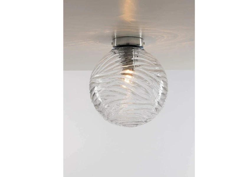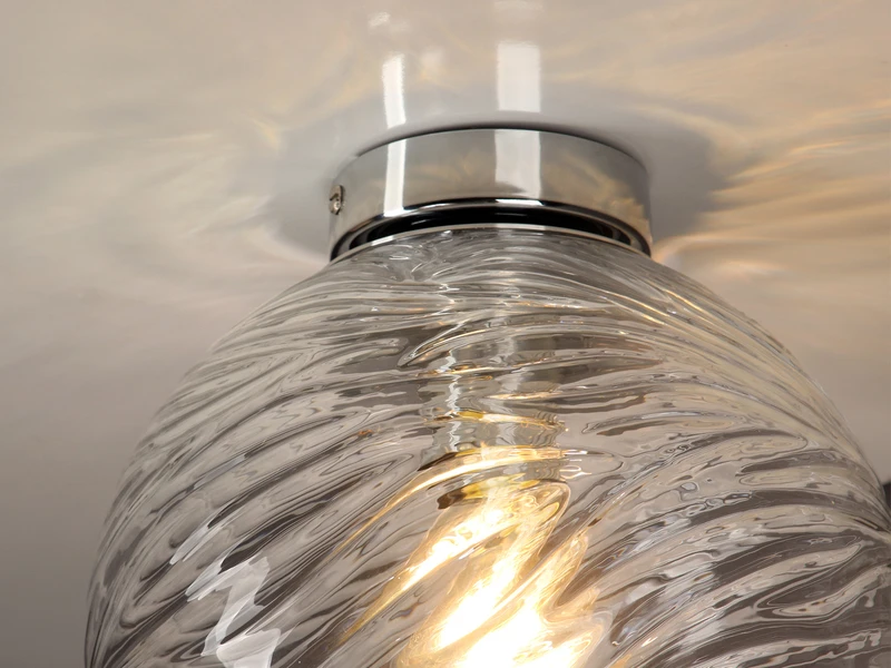 Die Design Deckenleuchte besteht aus einem Glasschirm mit einem Durchmesser von 30cm sowie einer Aufhängung in Chrom. Der Industrial Look der insgesamt 32cm hohen Leuchte wird durch den angesagten Farb- und Materialmix perfekt abgerundet und sorgt für ein tolles Erscheinungsbild. Durch die runde Form scheint das Licht nach oben und unten und erzeugt ein wirkungsvolles Lichtspiel an den Wänden.