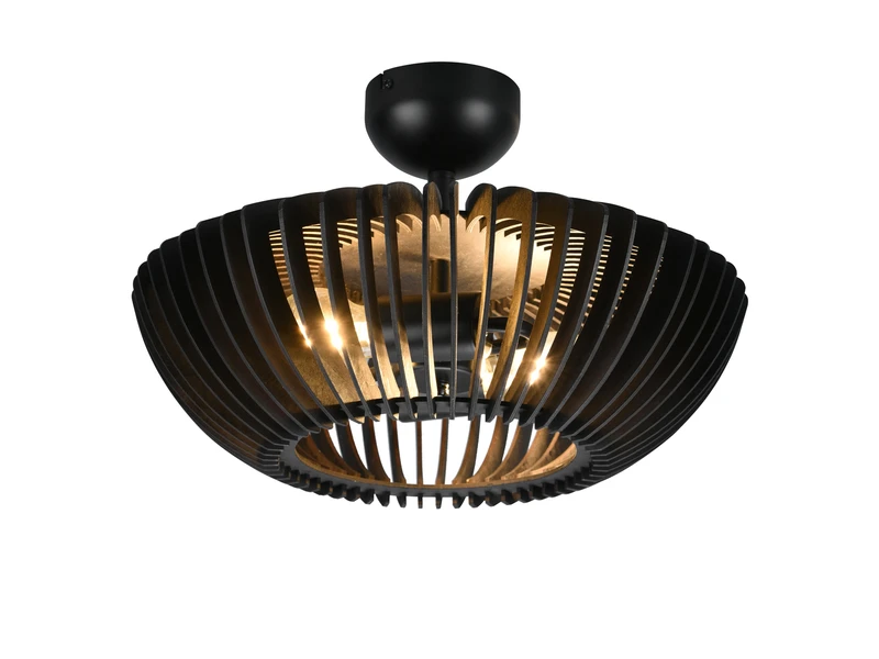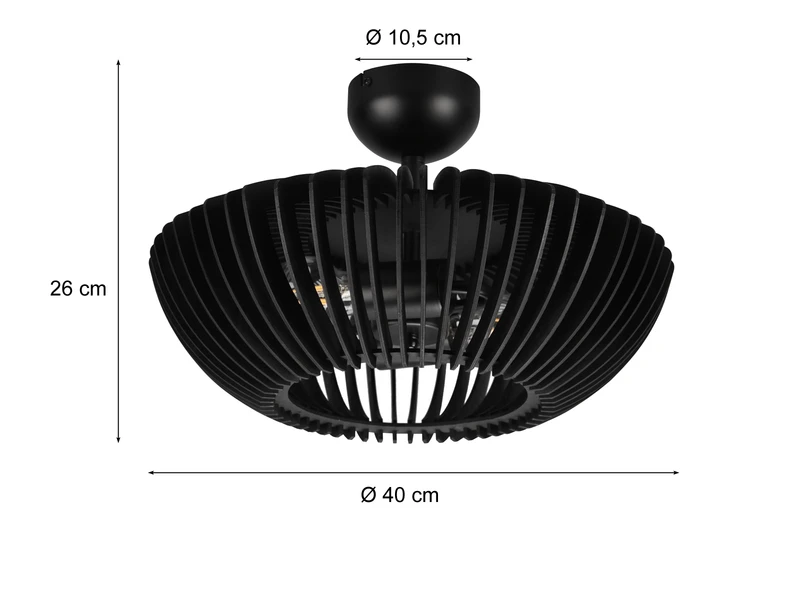 Die Deckenleuchte strahlt, durch den aus Holzlamellen gefertigten Schirm, Anmut und Eleganz aus. Das auffällig geschwungene Design schafft eine warme und gemütliche Lichtatmosphäre und bereichert Ihre Räumlichkeiten und Ihren Einrichtungsstil auf geschmackvolle Weise. Das schwarze Holz in Kombination mit Metall in Schwarz matt wirkt harmonisch und setzt moderne Akzente.