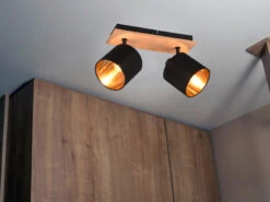Dank des schlichten Designs aus Metall mit 2 Stofflampenschirmen in Schwarz-Gold ist die Innenlampe schon im Hellen ein wahrer Hingucker, und lässt sich in verschiedene Einrichtungsstile integrieren. Die zusätzliche Kombination mit Holz schafft stilvolle Lichtakzente und verleiht Wohnräumen einen außergewöhnlichen Wohlfühleffekt.
