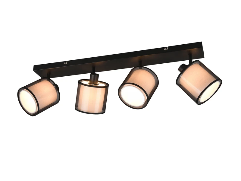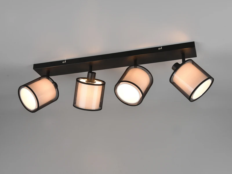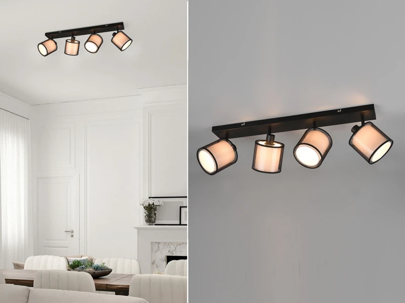 Die Leuchten ist mit ihren Textilschirmen der Inbegriff für Behaglichkeit. Das wohnliche Licht des vierflammigen Spots, welches durch die beiden verschiedenfarbigen Schirme ein gemütliches Ambiente zaubert, setzt besondere Lichtakzente. Die moderne Kombination aus einem inneren weißen Stoffschirm und einem äußeren transparent schwarzen Organza Stoffschirm wirkt individuell sowie erfrischend und lässt sich vielfältig in moderne Wohnstile integrieren.