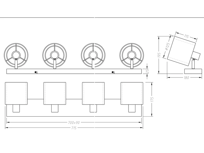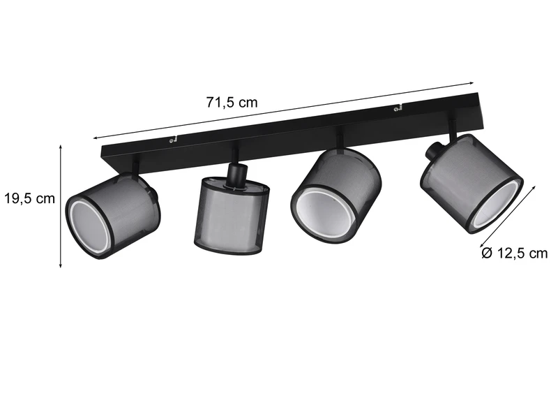 Der Deckenstrahler hat eine Breite von 71,5 cm, eine Höhe von 19,5 und eine Tiefe von 18 cm. Ausgestattet ist er mit vier E14 Fassungen und für Leuchtmittel bis max. je 28 Watt geeignet, und wird mit dimmbaren LED Leuchtmitteln mit je 5 Watt, 400 Lumen & 3000 Kelvin in Warmweiß geliefert. Diese LED Lampe können Sie über Ihre Hausinstallation dimmen und so zusätzlich für eine ganz individuelle Beleuchtung sorgen.