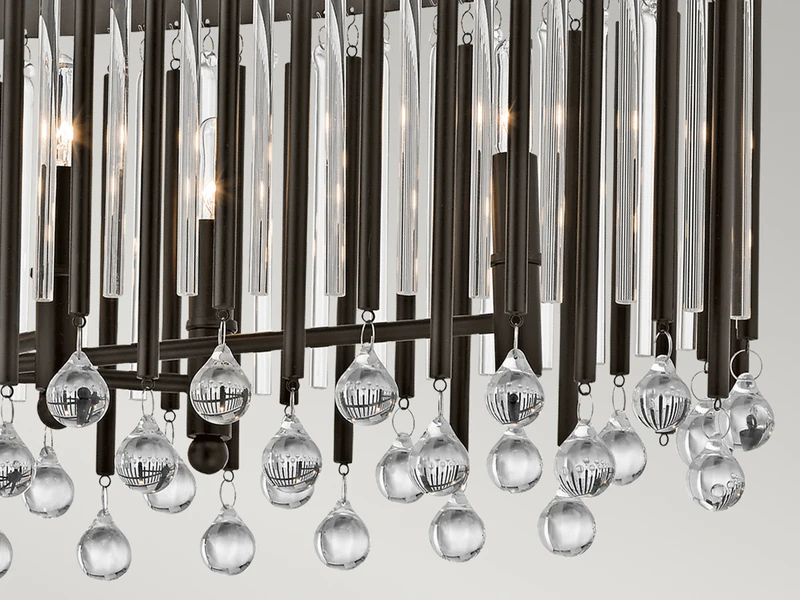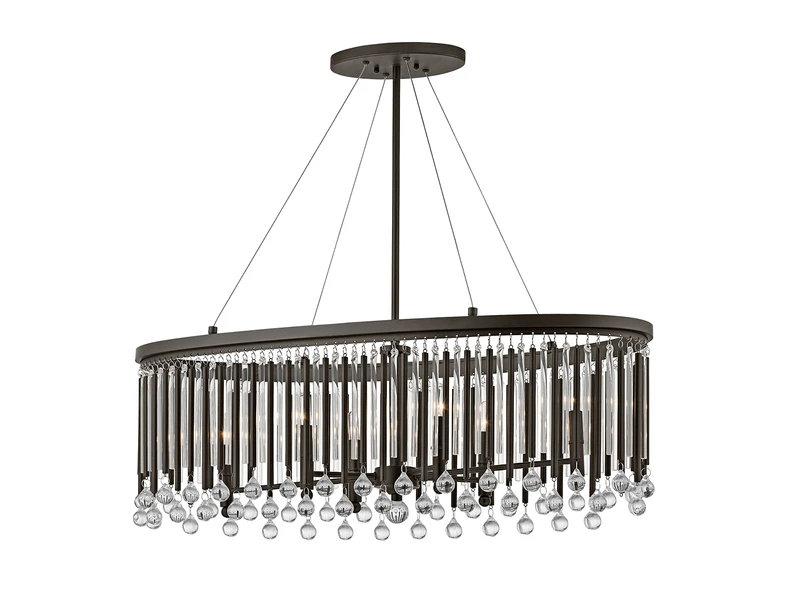 Der große ovale Lampenschirm ist bestückt mit Echtglaselementen, die für faszinierende Lichtspiele sorgen. Das solide Metallgestell ist in Espressofarben lackiert und rundet das luxuriöse Erscheinungsbild dieser Designerleuchte ab, die ein absoluter Eyecatcher in jedem Innenbereich ist. Zudem kann der Lüster in der Höhe von 42cm bis 134cm eingestellt werden.