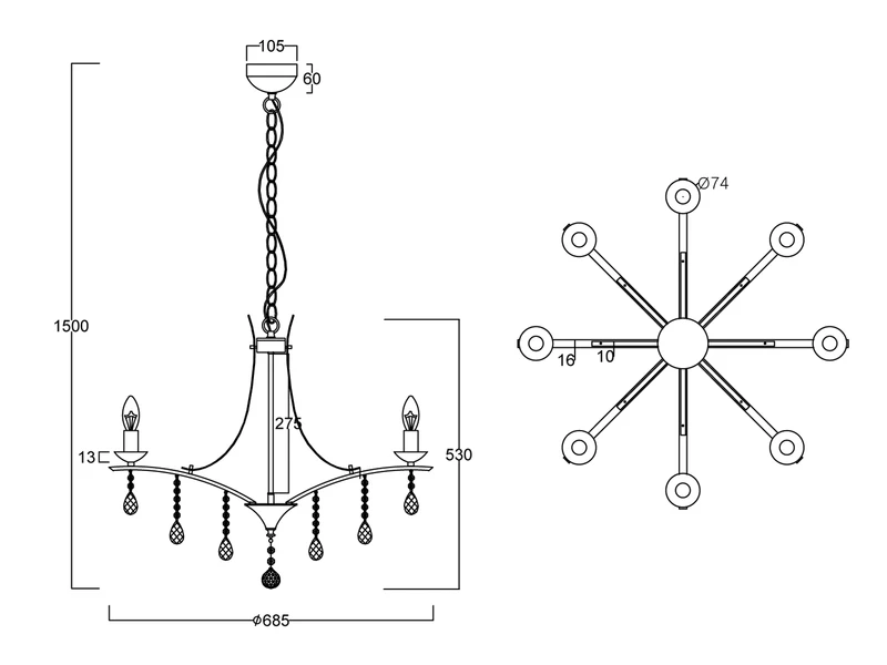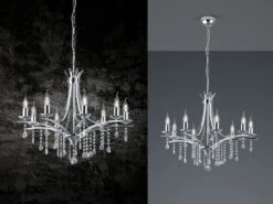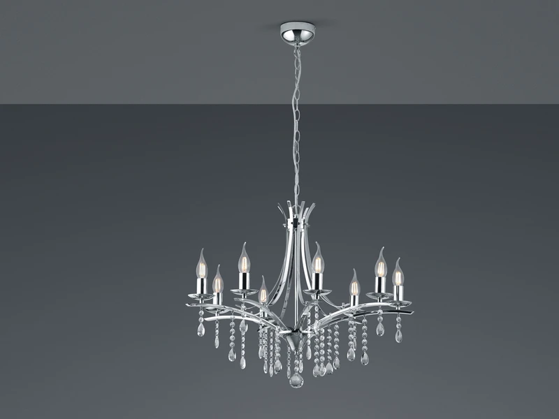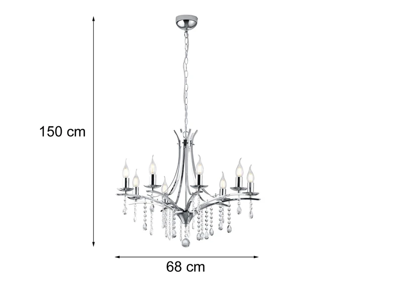 Der Lüster hat einen Durchmesser von 68cm und eine Abhängung von 150cm. Die acht E14 Fassungen können mit Leuchtmitteln mit einer Leistung von max. je 40 Watt bestückt werden.