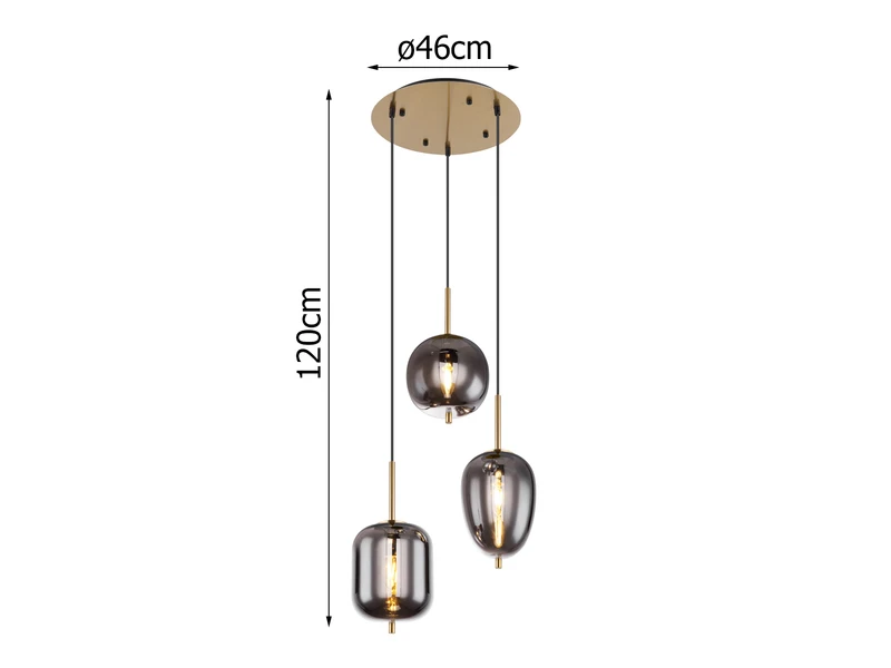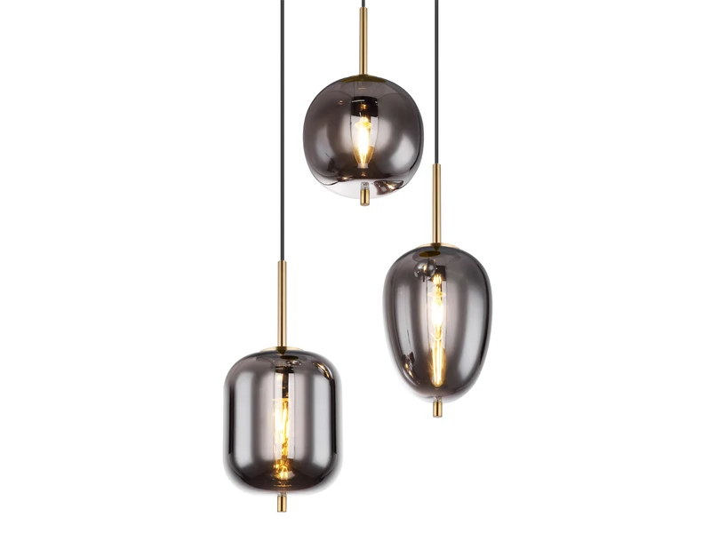 Diese hochwertige Kugellampe besteht aus einer runden, messingfarbenen Metallplatte, an der drei schwarze Kabel mit rauchfarbenen Glaskugeln unterschiedlicher Form hängen. Diese sind ebenfalls mit messingfarbenen Metallelementen versehen.