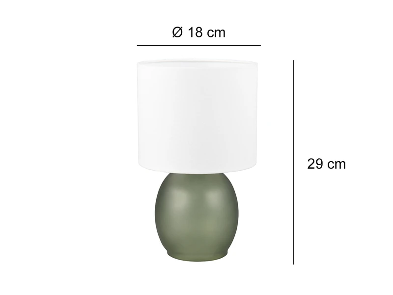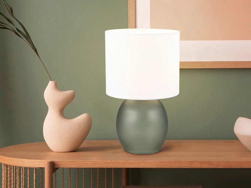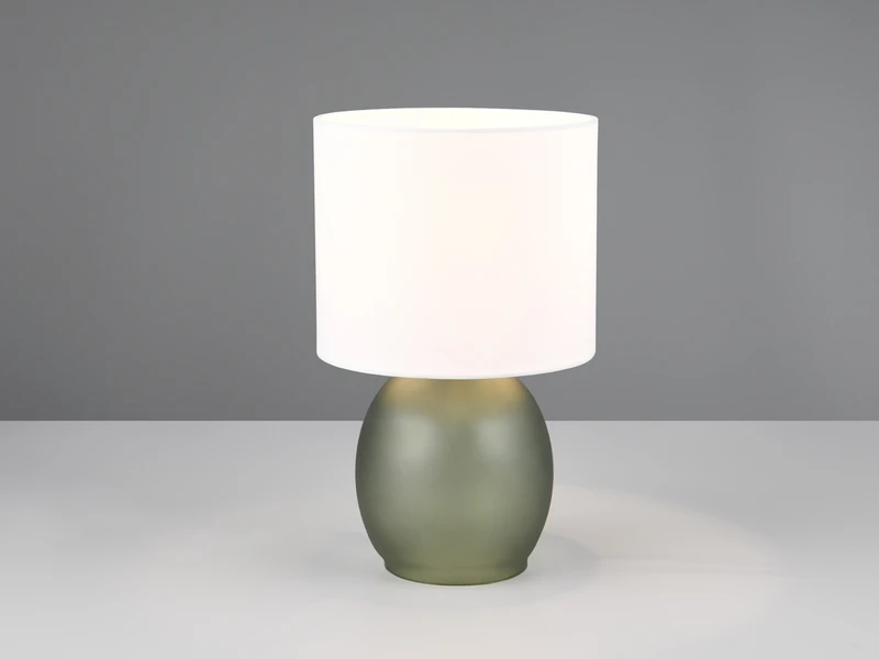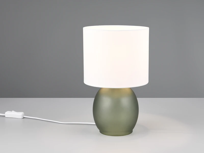 Der weiße Stoff Lampenschirm der zeitlosen Leuchte wird durch einen grünen Glasfuß ergänzt, der der Tischlampe klassische Eleganz verleiht und ihr unaufdringliches Design komplettiert.