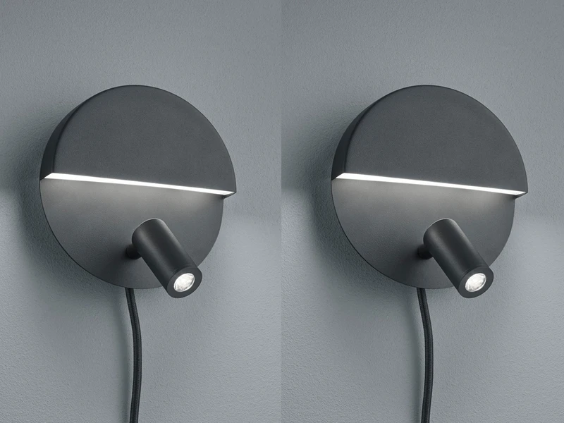 Jede Leuchte ist mit fest verbauten LEDs ausgestattet: Hauptlicht 1x 6 Watt, 600 Lumen und 3000 Kelvin – Leselampe 1x 2,3 Watt, 200 Lumen und 3000 Kelvin.