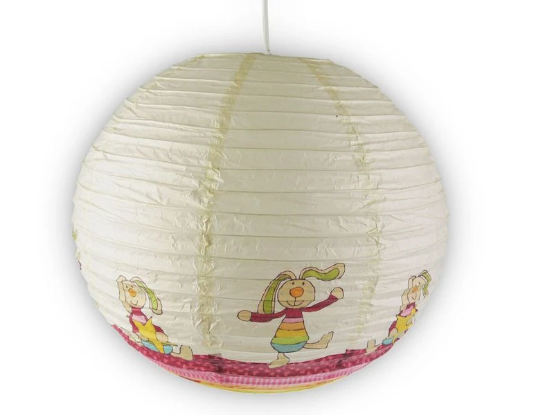 Die Kinder Hängelampe mit Papier Lampion ist vielseitig in jedem Kinderzimmer einsetzbar – mit ihrem kindgerechten und ansprechenden Häschen Design sorgt die Kinder Deckenleuchte für Begeisterung. Ganz gleich ob Sie auf der Suche nach Kinderlampen für Mädchen Jungen oder Kinderzimmerlampen fürs Baby sind, mit der neutralen Farbgebung und dem fröhlichen Rabbit Motiv ist diese Kinderleuchte für viele Kinderzimmer geeignet. Auch als Deckenlampe im Babyzimmer macht dieses Kinderlicht eine angenehme Atmosphäre. Der Papierlampenschirm der Kinder Hängeleuchte hat ein Durchmesser von 40 cm.