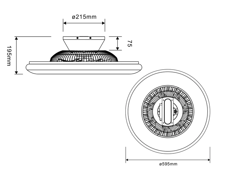 Die Deckenleuchte mit Ventilator hat einen Durchmesser von 59cm und ist mit einer Höhe von nur 20cm für einen Deckenventilator sehr flach.