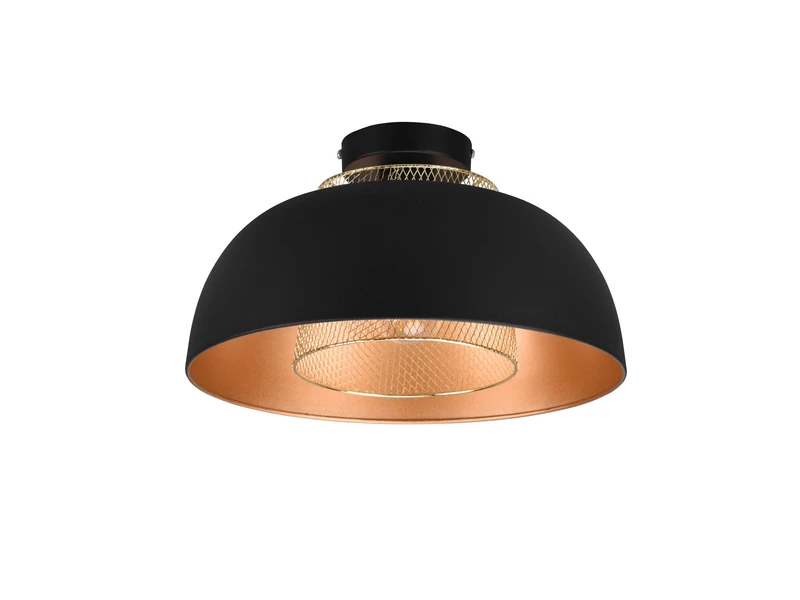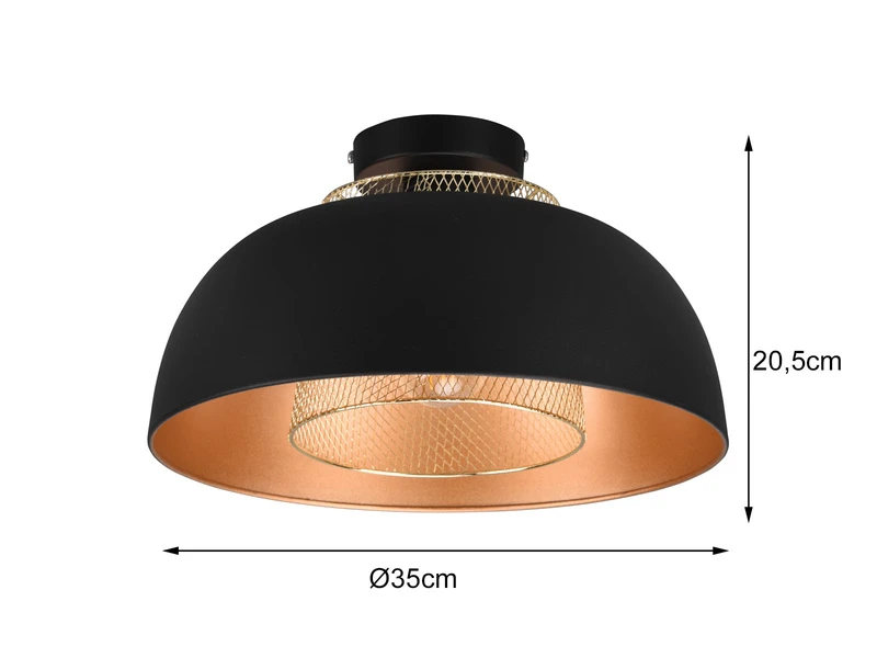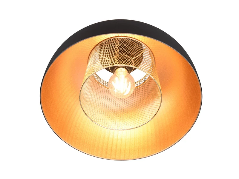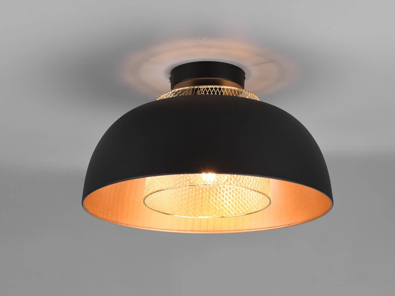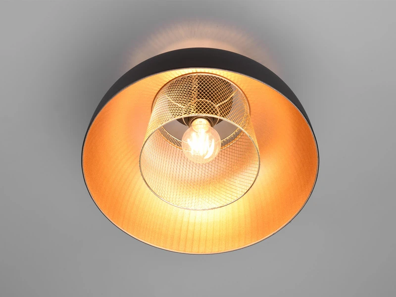 Der große Schirm, der von innen durch einen zweiten kleineren Schirm in Gitteroptik als Designelement ergänzt wird, kommt wunderbar zur Geltung und sorgt für besondere Lichteffekte. Die stilvolle Form- und Farbgestaltung der Leuchte in Schwarz matt und Goldfarben verleiht Ihrem Zuhause ein gemütliches Ambiente.