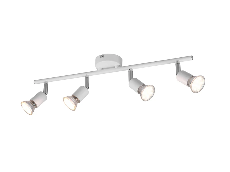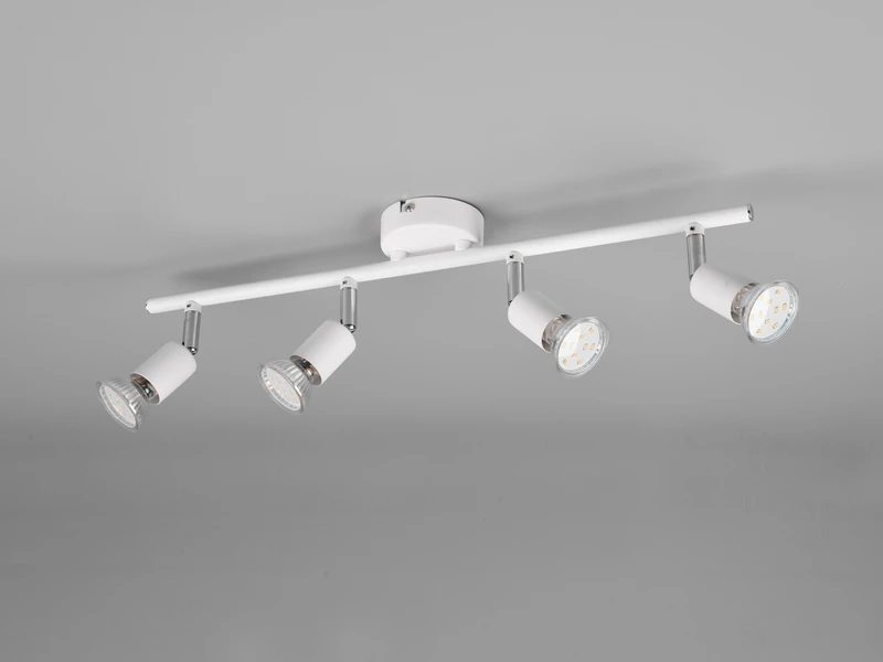 Dank der klaren Linien und der runden Formen macht die 4 flammige Leuchte besonders im Wohn- oder Esszimmer eine gute Figur. Dank des flexibel schwenkbaren Spotkopfes ist es möglich, unterschiedliche Gegenstände oder Wohnbereiche gekonnt in Szene zu setzen. Die Farbgestaltung in Weiß matt lässt viel Spielraum bei der Kombination mit vorhandenen Farbkonzepten und rundet jeden gradlinigen Einrichtungsstil ab.