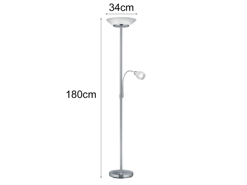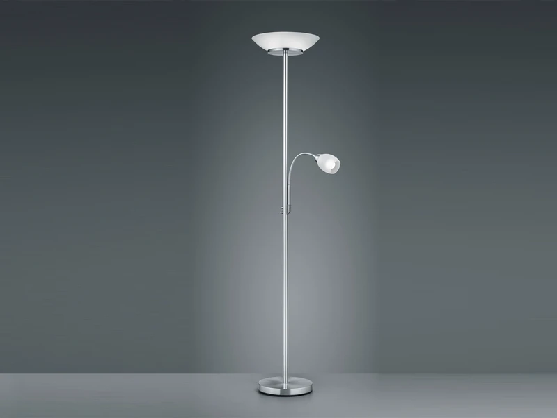 Die 180 cm hohe Stehleuchte ist aus Metall in der Farbe Nickel matt gefertigt, die beiden Lampenschirme bestehen aus weißem Glas. Die Leselampe ist flexibel einstellbar und passt sich Ihren Wünschen optimal an. Der nach oben gerichtete Fluter verstrahlt ein gemütliches Licht nach oben. Mit dem in Griffhöhe am Leuchtenkorpus angebrachten Ein-/Ausschalter lässt sich die Standlampe bequem bedienen, wobei Leselicht und Deckenfluter getrennt einschaltbar sind.