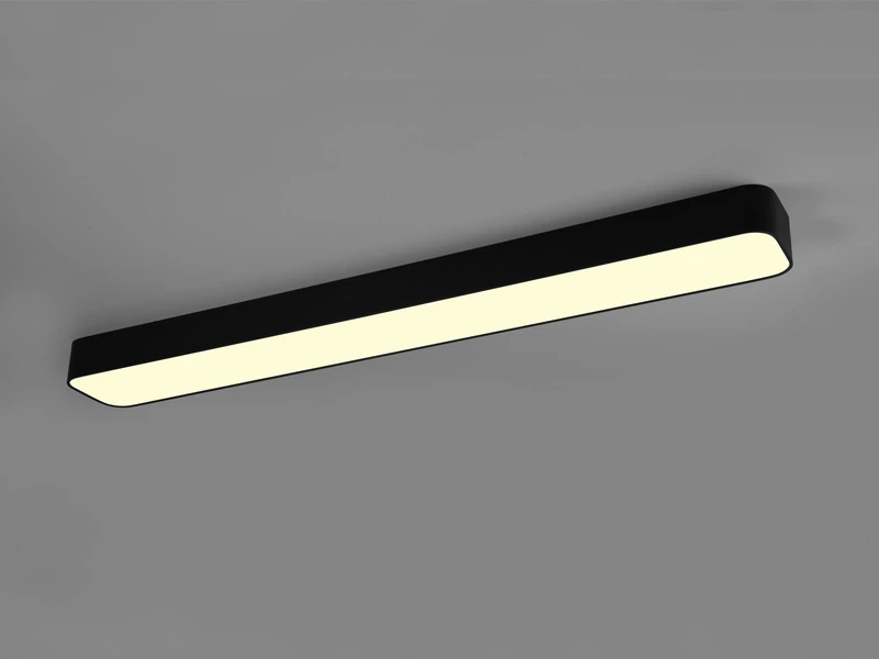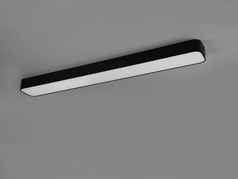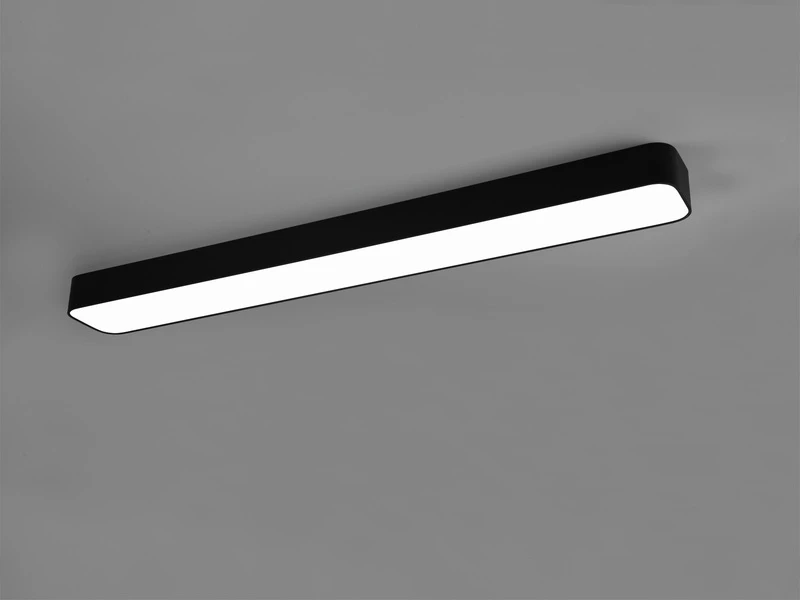 Geradlinig und unaufdringlich in ihrer schlanken Form, passt sich die rechteckige LED Deckenlampe mit einer Größe von 118cm x 14cm, sowie eine Höhe von 7cm vielen Einrichtungsstilen an. Im modernen Schwarz matt bietet die Leuchte zahlreiche Anwendungsmöglichkeiten, und ist zur Wand- und Deckenmontage geeignet.