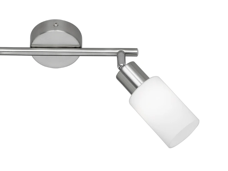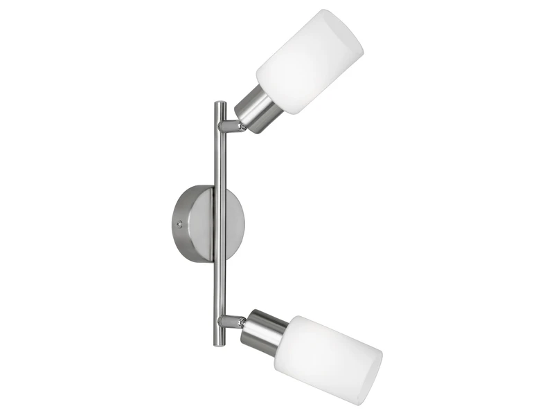 Die 2-flammige Leuchte hat eine Höhe von 21cm, ist 25cm breit, der Fuß Durchmesser ist 8cm. Das Metallgestell in Silber matt mit dem Opal mattem Glas lässt sich nahtlos in alle Einrichtungsstile integrieren.