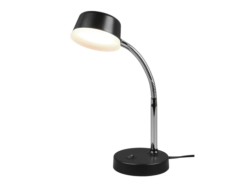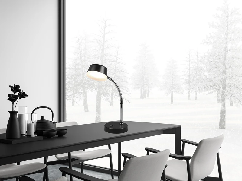Für eine ideale Ausrichtung des Lichts kann der Hals flexibel angepasst werden. Durch den Schalter am Leuchtenfuß, ist ein bequemes ein- und ausschalten gewährleistet. Das minimalistische Design und die schwarze Farbgestaltung sorgen für eine perfekte Integration in vorhandene Einrichtungen. Die Tischleuchte hat eine Höhe von 34cm und eine Auslage von 20cm.