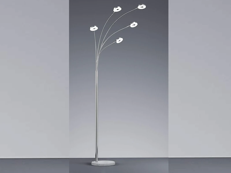 Die fünfflammige Leuchte hat eine Höhe von 190cm und lässt dunkle Ecken in neuem Glanz erstrahlen. Sie dient ideal als unterstützende Lichtquelle und findet in fast allen Wohnräumen einen Platz. Die einzelnen Leuchtenarme können indiviudell ausgerichtet werden um einzelne Bereiche bewusst in Szene zu setzen.