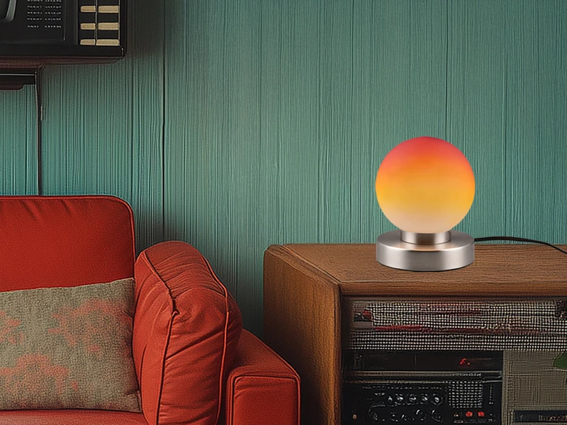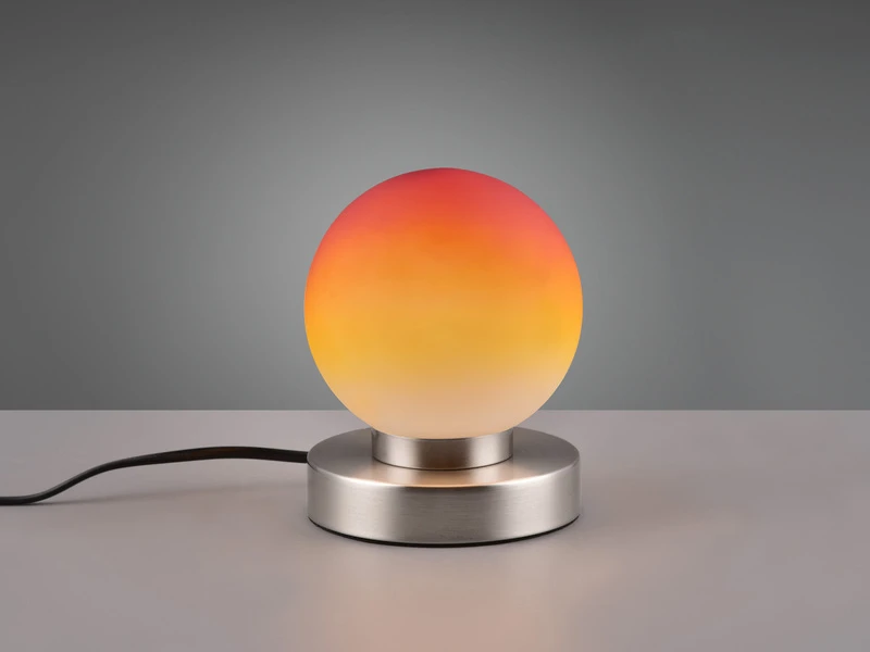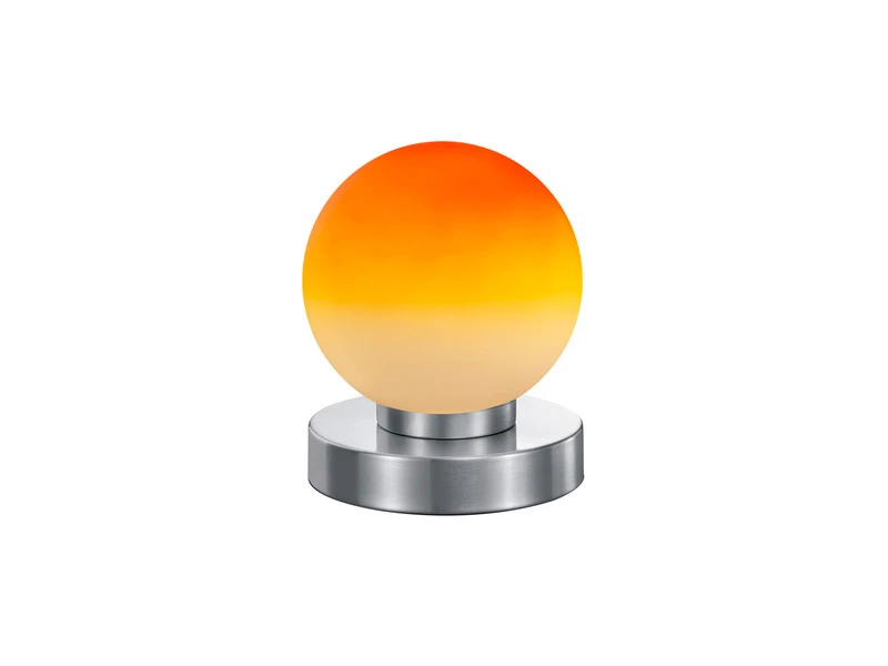 Der runde kugelförmige Schirm hat einen Durchmesser von 12cm und ist aus Glas in Orange gefertigt. Der Sockel aus Metall in Silber matt verleiht der insgesamt 15cm hohen Tischlampe einen eleganten Charakter.
