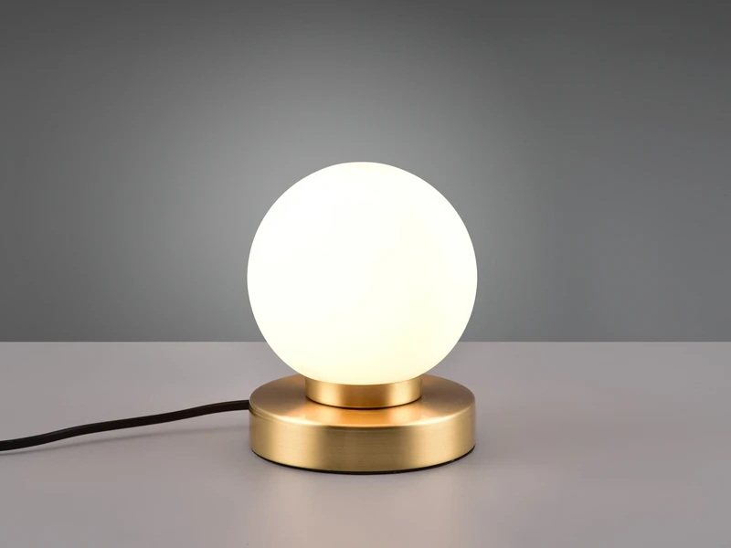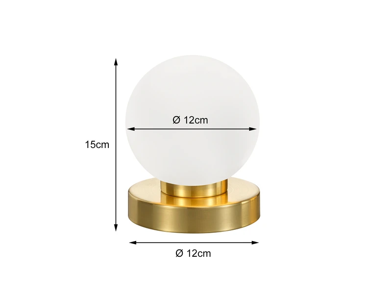 Der runde kugelförmige Schirm hat einen Durchmesser von 12cm und ist aus Glas in weiß matt gefertigt. Der Sockel aus Metall in Messing matt verleiht der insgesamt 15cm hohen Tischlampe einen eleganten Charakter.