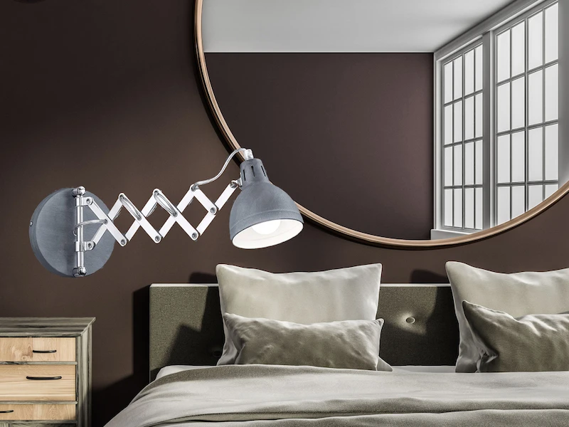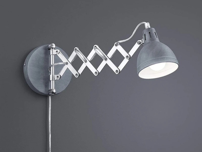 Der schicke Schirm in Betonfarbig aus Metall ist ganz im angesagten Industrie Look gehalten. Er verleiht der Leuchte mit Scherenarm ihren ganz eigenen Charakter. Die Innenseite des Schirms mit einem Durchmesser von 11cm ist in weiß lackiert und komplettiert das einzigartige Erscheinungsbild der Leseleuchte.