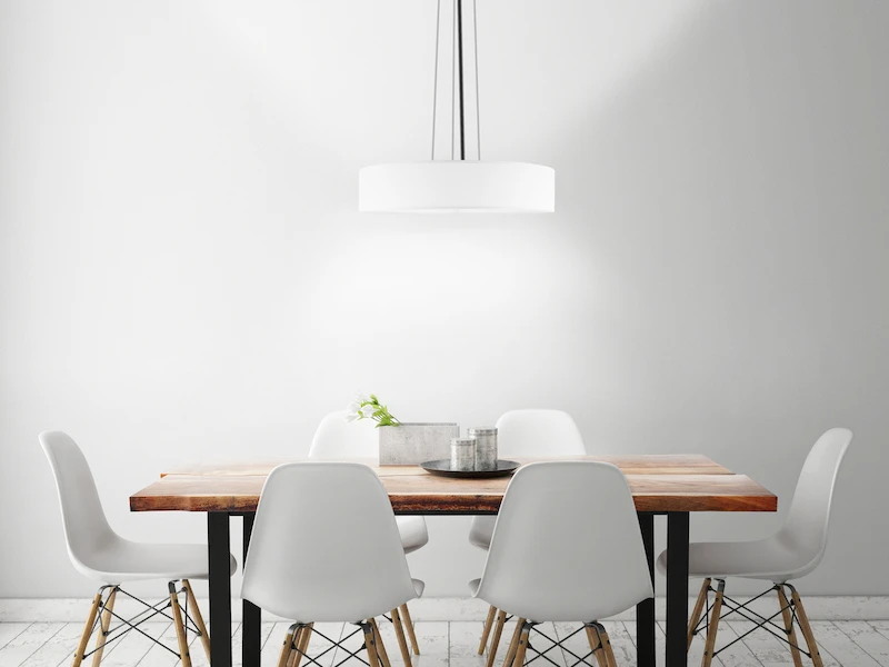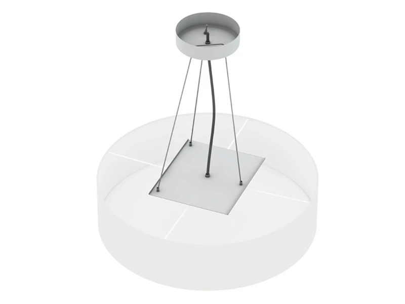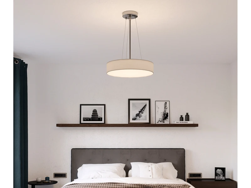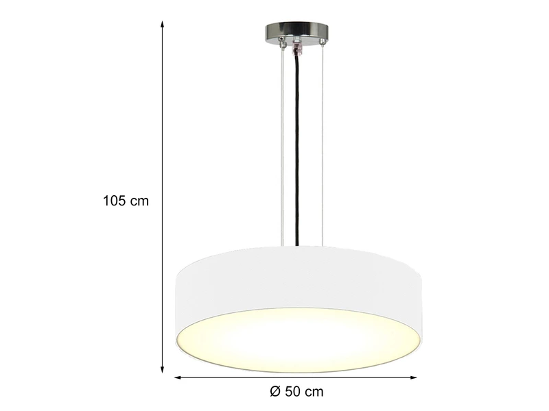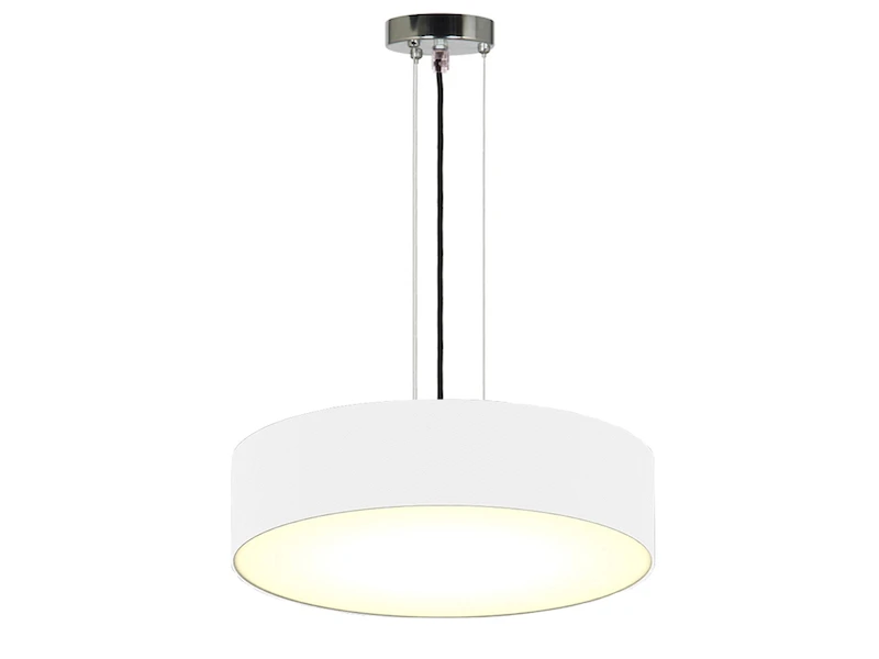 Der weiße Stoff Lampenschirm verleiht der Hängeleuchte ihren ganz eigenen Charakter. Mit einem Schirmdurchmesser von 50 cm sowie einer kürzbaren silbernen Abhängung von 105 cm kommt das schöne Design des Pendels angenehm zur Geltung. Im Zusammenspiel mit der unteren, weißen Kunststoffabdeckung sorgt die Leuchte für ein blendfreies Licht Ambiente.