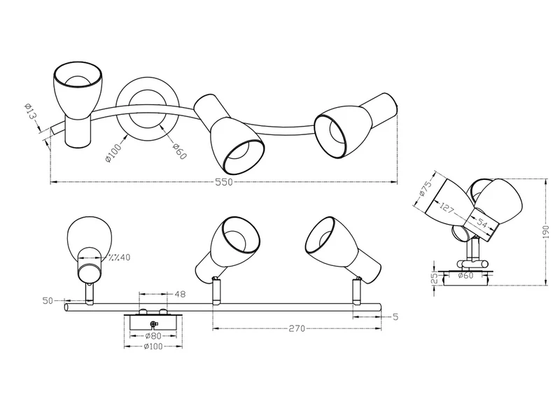 Die Leuchten sind mit je drei E14 Fassungen ausgestattet und werden jeweils mit 3 austauschbaren LED Leuchtmitteln mit einer Leistung von je 5 Watt und 400 Lumen in Warmweiß geliefert.