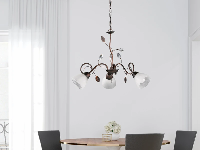 Mit ihrem typisch mediterranem Charme verleiht die rostfarbige Pendellampe im Antik-Look jedem Raum das gewisse etwas. Diese hochwertige Pendelleuchte beeindruckt mit ihrer aufwändig gestalteten Krone mit Blätter-Design aus Metall und den schlichten alabasterfarbigen Glasschirmen.