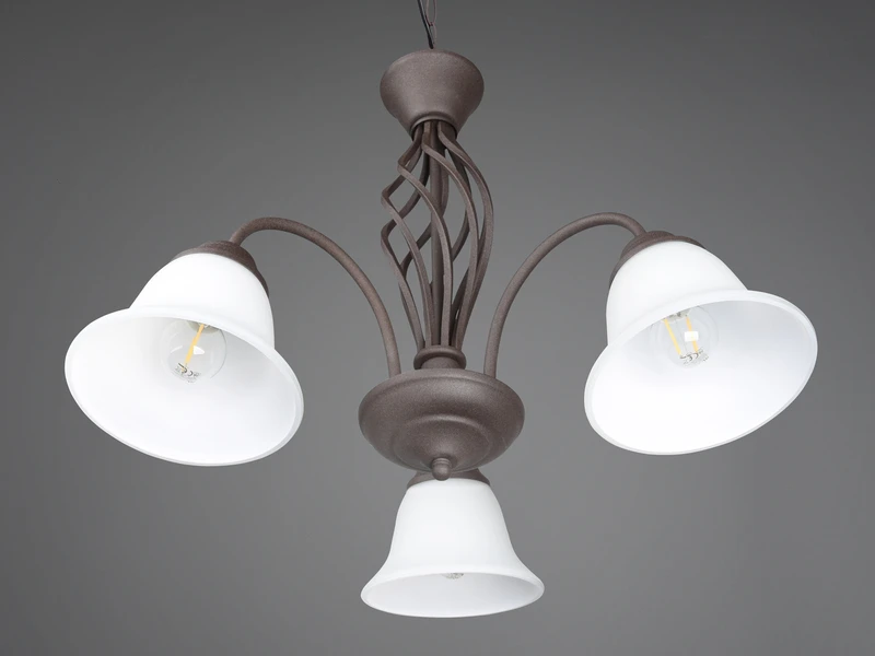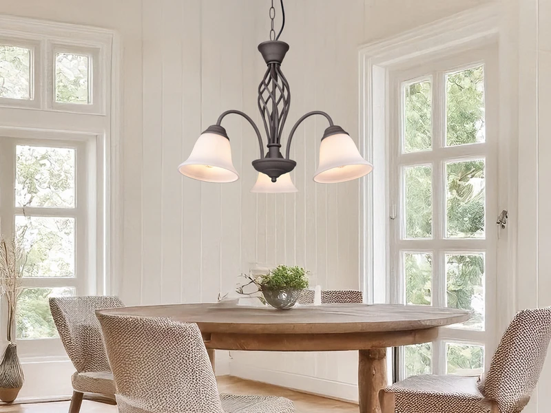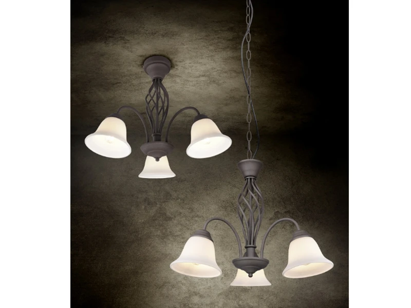 Rustikale Metallelemente treffen auf stilvoll geschwungene Glasschirme, die in Kombination ein besonderes Ambiente schaffen. Die angenehme Rostoptik unterstreicht das rustikale Design der Leuchte, die sich vorzugsweise in klassischen Einrichtungsstilen wiederfindet oder bei modernen Wohnkonzepten für einen spannenden Stilbruch sorgt.