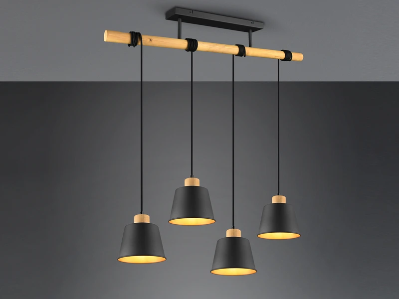 Die vier Lichtquellen können individuell in der Höhe variieren und erzeugen eine wohlige Atmosphäre. Durch die Farbgestaltung, der Lampenschirme in Schwarz matt und innen Gold, in Kombination mit Holz, lässt sich die Industrial Style Lampe mühelos in bereits vorhandenes Interieur einfügen und setzt tolle Kontraste.